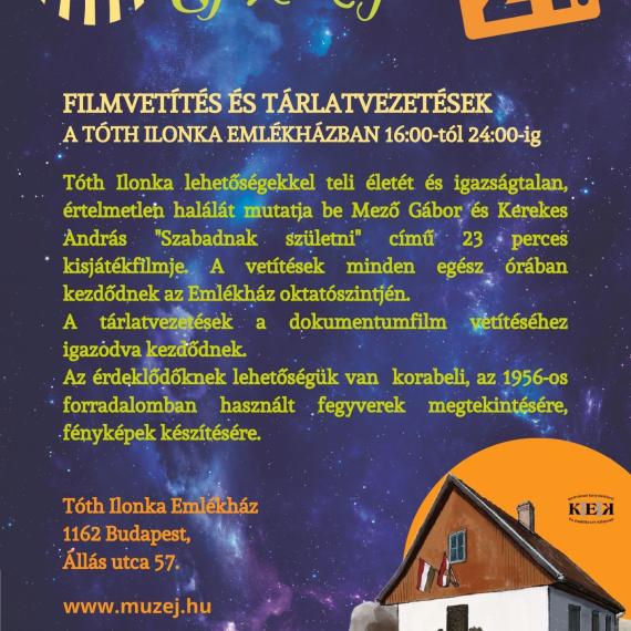 Tóth Ilonka lehetőségekkel teli életét és igazságtalan, értelmetlen halálát mutatja be Mező Gábor és Kerekes András "Szabadnak születni" című 23 perces kisjátékfilmje. A vetítések minden egész órában kezdődnek az Emlékház oktatószintjén.